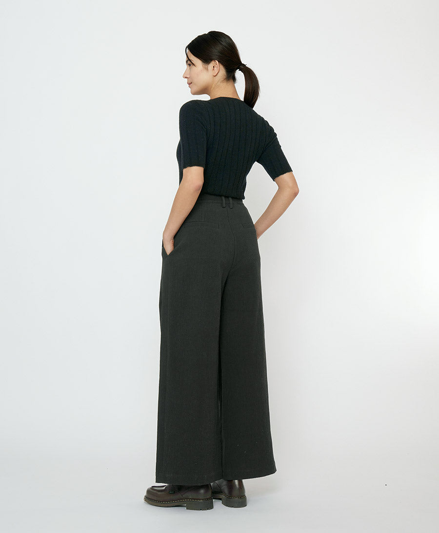 Eine bequeme Hose mit einer schmeichelhaften, weite knöchellange Beinsilhouette. Diese Hose sitzt auf der hohen Taille. Sie hat eine leichte A-Linien-Silhouette, ein extra weites Bein, ein eingenähte doppelte Bundfalte sowie Hosenschlitz mit Reiss- und Knopfverschluss. Zwei Seitentaschen und zwei Hintertaschen.