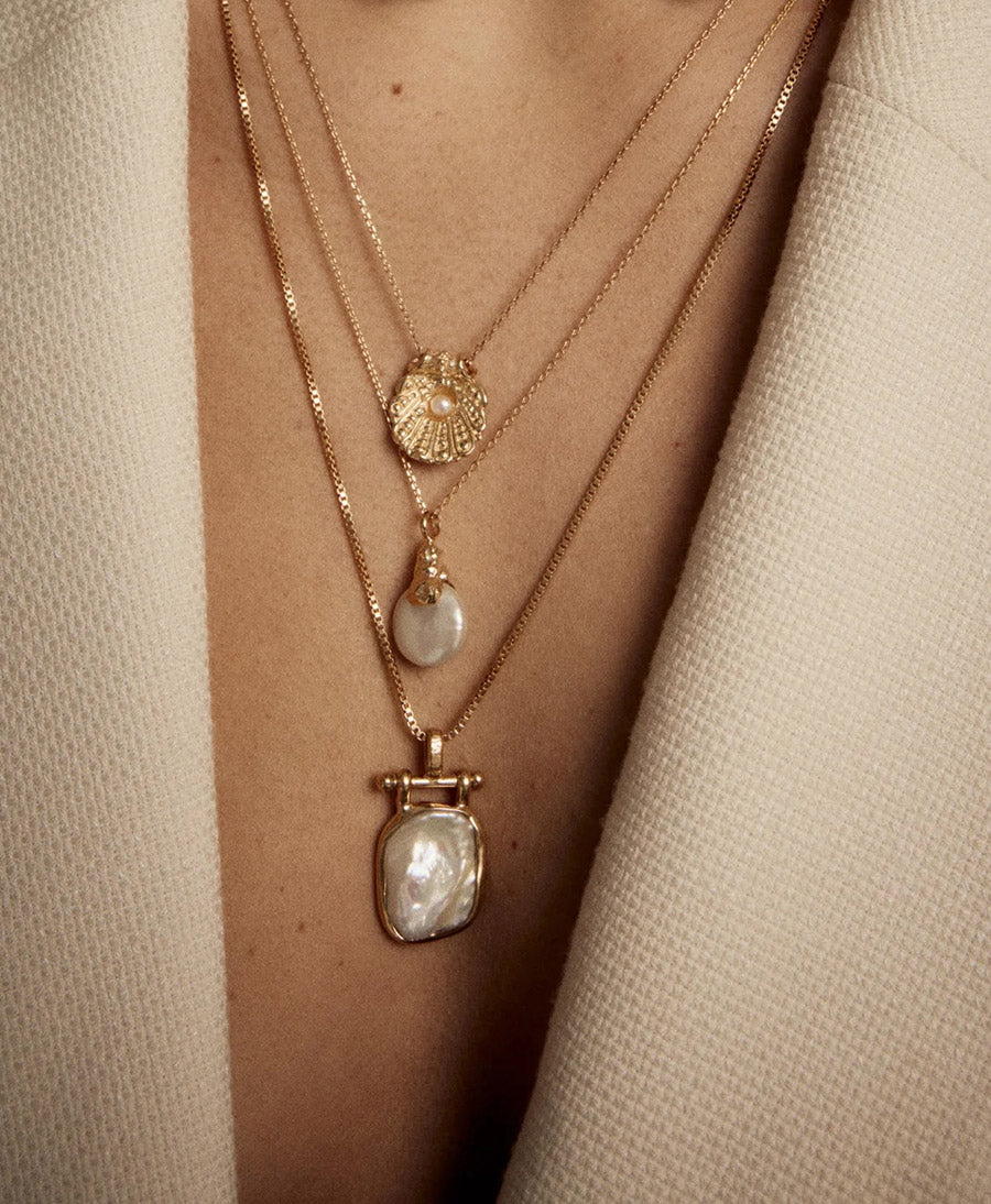 Wunderschöne goldene Muschelkette, mit der du deine Erinnerungen an den Strand das ganze Jahr über festhalten kannst. Der Anhänger mit einer Perle soll die einzigartige Umwandlung des Weichtieres in eine wertvolle Perle symbolisieren. Mimi et Toi sieht darin ein Symbol für die Umwandlung von etwas Negativem in etwas Positives. Aus diesem Grund wird die Perle auch oft mit Glück assoziiert.
