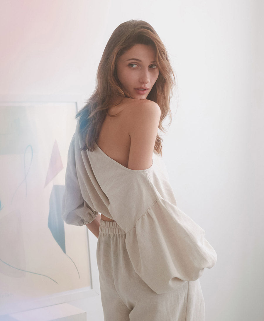 Diese Boho-Bluse kombiniert femininen Stil mit müheloser Eleganz. Sie ist aus einer hochwertigen Mischung aus Bio-Baumwolle und Leinen gefertigt und verfügt über einen schmeichelhaften Gummizug in der Taille, einen schulterfreien Ausschnitt und Ballonärmel.
