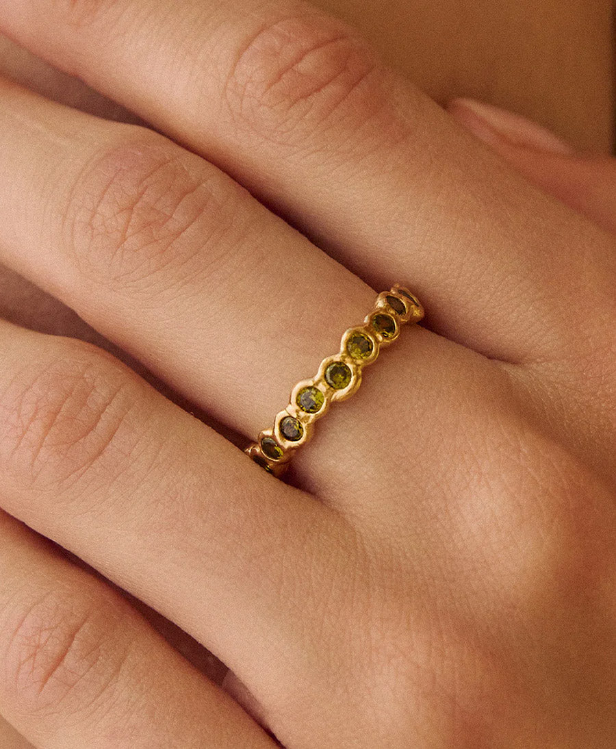Das Design des Ewigkeitsrings Amélia II ist mit dunkelgrünen Steinen besetzt, die das Licht einfangen und reflektieren.