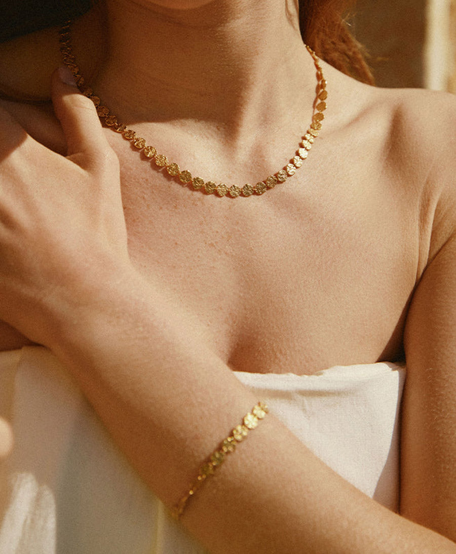 Diese Halskette besteht aus einer Abfolge kleiner, gehämmerter Goldscheiben, die ein durchgehendes Design schaffen, das an antiken Münzschmuck erinnert.