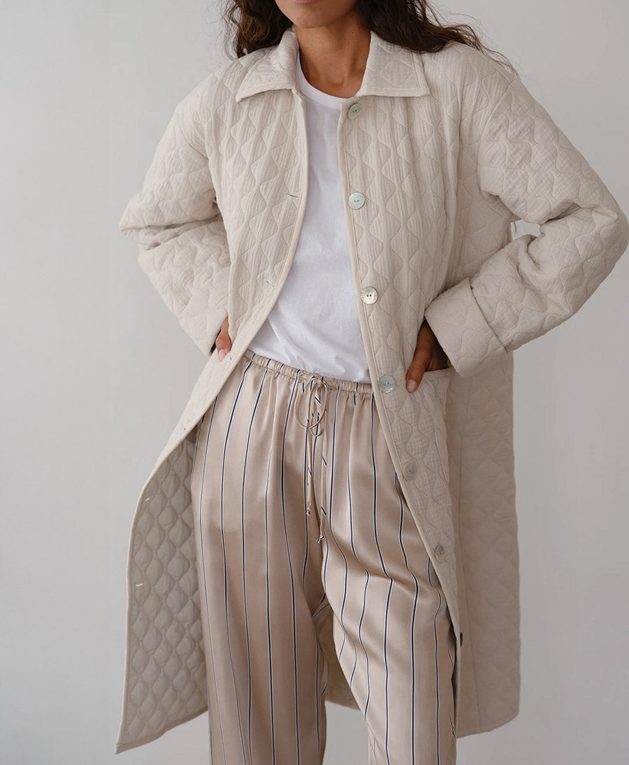 Dieser Steppmantel wird aus angenehmem Stoff hergestellt. In schöner heller Creme-Farbe.