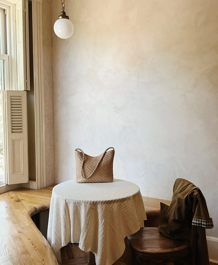 Diese gewobene Ledertasche aus der neuen Kollektion von Bembien ist ein echtes Lieblingsstück. Das nostalgische und verspielte Design wird in traditioneller Handwerkskunst perfektioniert. Die organische, schlanke Form passt perfekt für den Alltag und für viele Anlässe. andgefertigt aus weichem, gewebtem Leder. Die Oberseiten lassen sich umklappen und mit einem Magnetverschluss verschliessen. Bietet komfortablen Platz für dein Tablet.