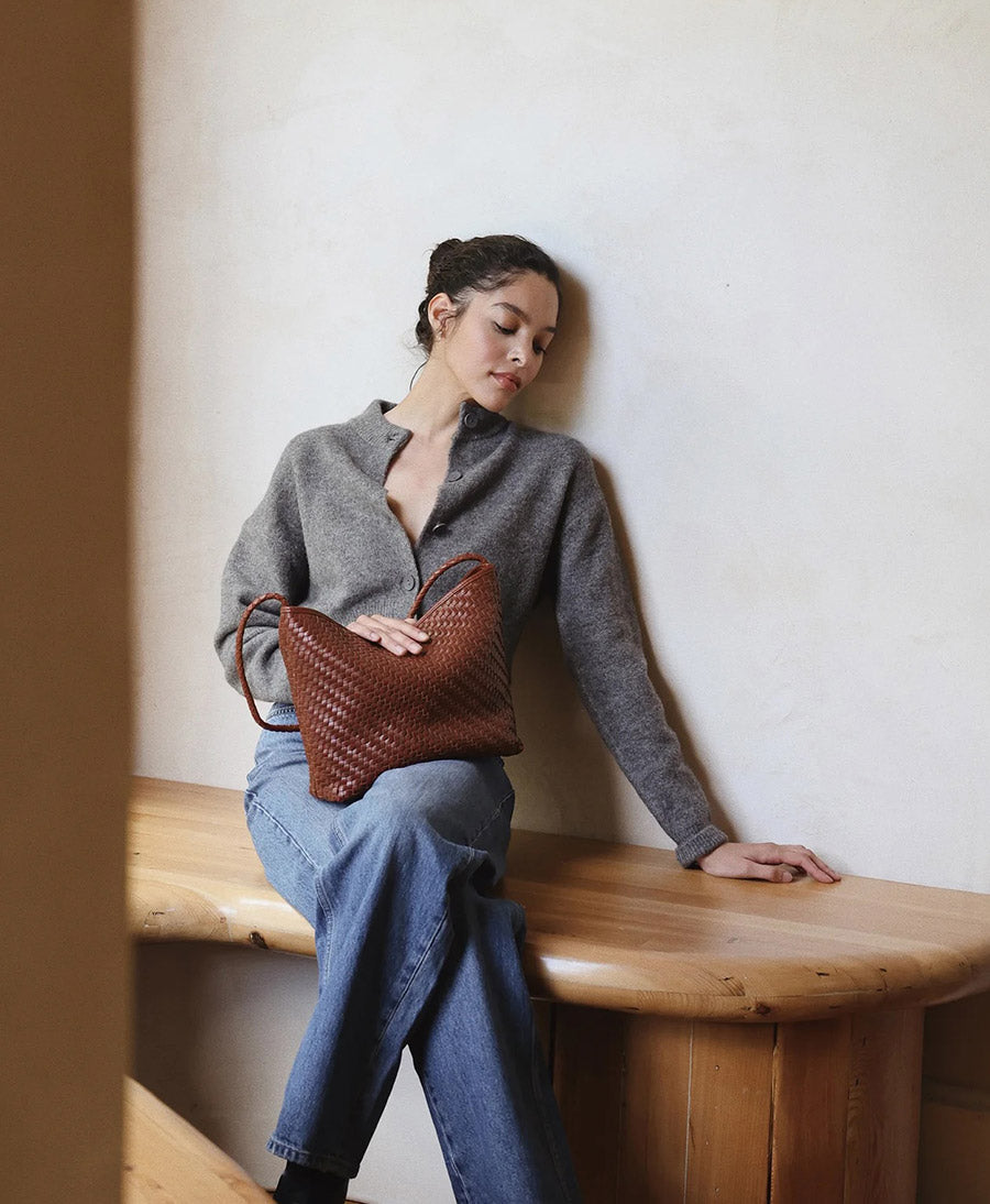 Diese gewobene Ledertasche aus der neuen Kollektion von Bembien ist ein echtes Lieblingsstück. Das nostalgische und verspielte Design wird in traditioneller Handwerkskunst perfektioniert. Die organische, schlanke Form passt perfekt für den Alltag und für viele Anlässe. andgefertigt aus weichem, gewebtem Leder. Die Oberseiten lassen sich umklappen und mit einem Magnetverschluss verschliessen. Bietet komfortablen Platz für dein Tablet.
