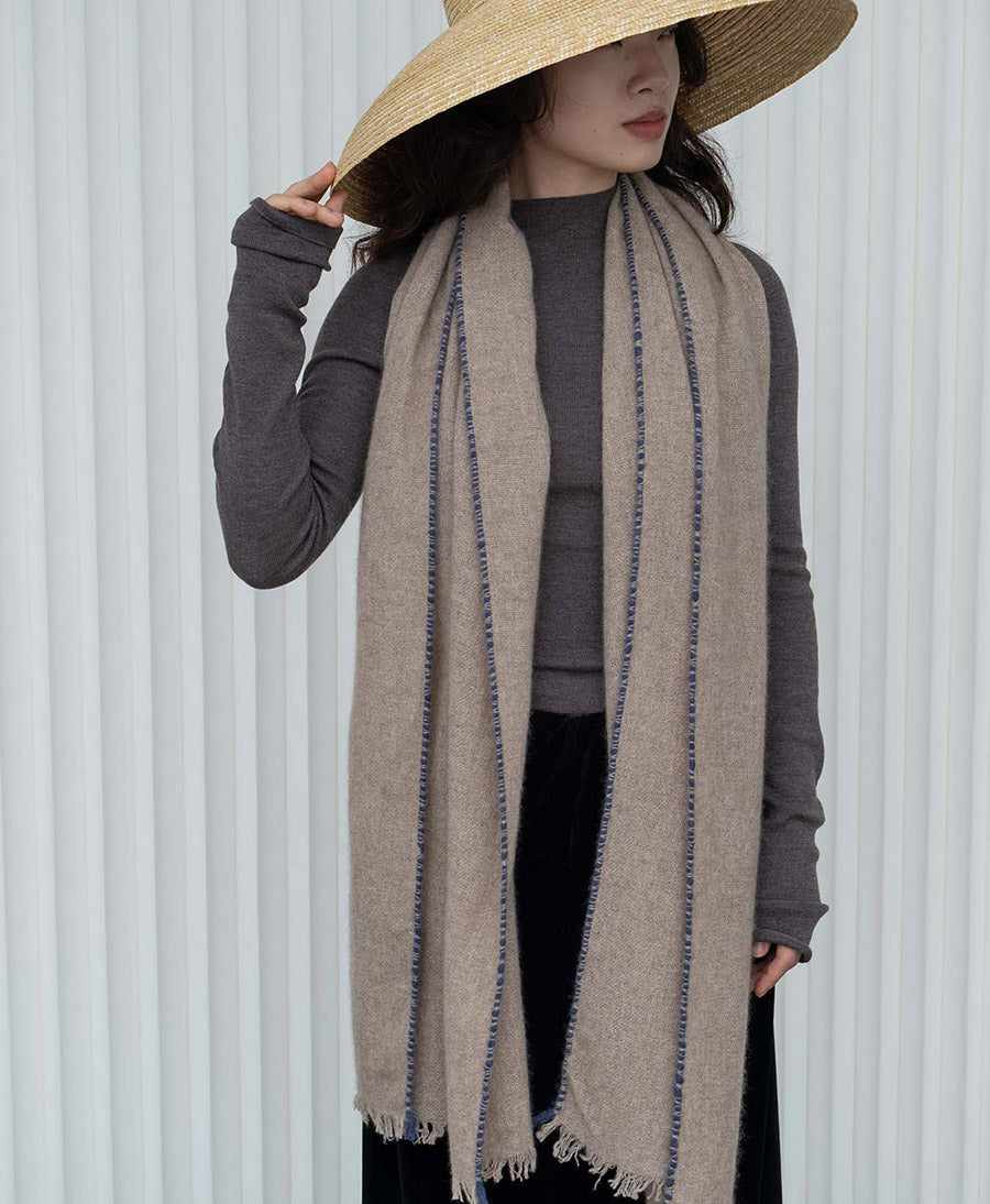 Setze ein modisches Statement mit diesem zeitlosen und wunderbar weichen Kaschmirschal. Der luxuriöse, leichte und luftige Kaschmirstoff ist beige mit blauem Detail am Rand. Das Halstuch aus hochwertigem Kaschmirgarn fühlt sich so wunderbar weich und bequem an. Schwebe in weichem Luxus mit diesem atmungsaktiven, ganzjährig tragbaren Accessoire.