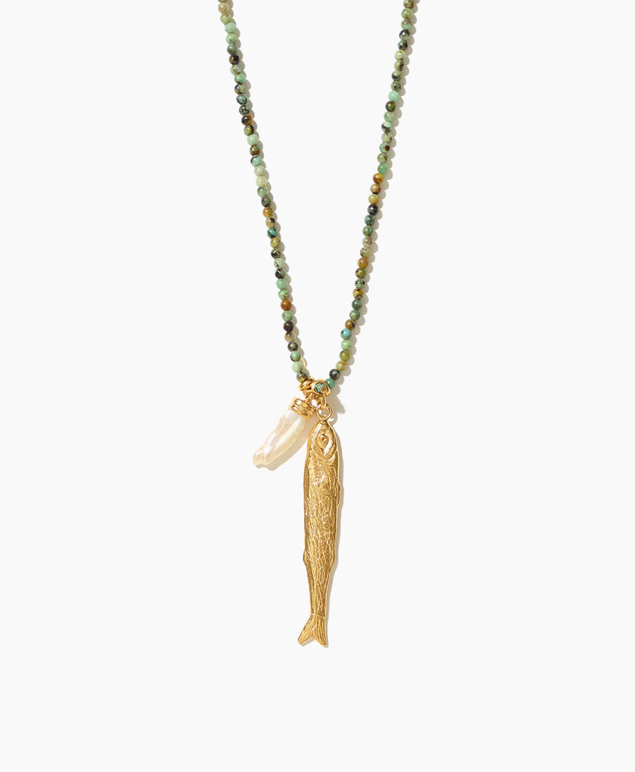 Farbige Halskette von dem Label Mimi et Toi aus Amsterdam. Mit schönen kleinen grünen Perlen aus grünen Achat-Steinen (gemixte Grüntöne) und vergoldetem Verschluss und Fisch-Anhänger und Perlen-Anhänger.