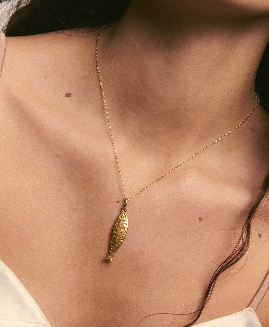 Das Fisch-Amulett hat mehrere Bedeutungen: Für Symbolisten steht er für den Anfang von allem, für Wasser und ist auch ein Symbol für die mediterrane Kultur. Mit einer zarten Kette in 44 cm Länge.