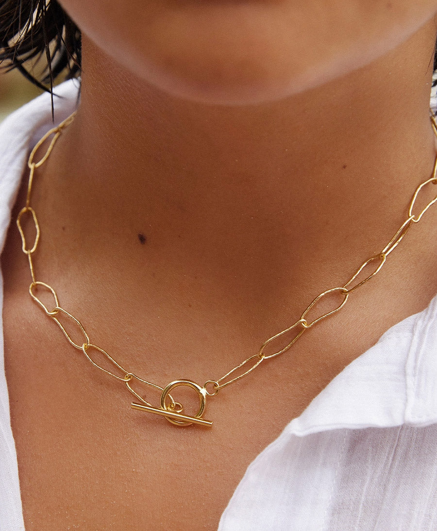 Schöne kurze Halskette "Horace" von Agapée mit verflochtenen Glieder welche ewige Freundschaft symbolisieren sollen. Vielseitig dank des eleganten Knebelverschlusses, kann sie alleine oder zusammen mit weiteren Ketten getragen werden. Der Verschluss kann vorne präsentiert werden, oder du kannst ihn auch hinten am Hals tragen. Die schöne Halskette ist aus Messing gefertigt und vergoldet. Ethisch korrekt hergestellt in Paris, Frankreich.