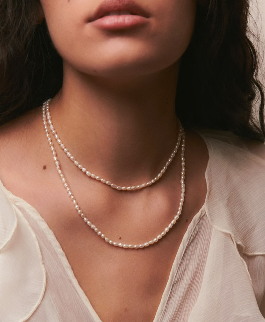 Klassische Halskette aus natürlichen Mini-Flussperlen, erhältlich in zwei Längen bei uns im Sortiment. Alle Stücke sind einzigartig und unterscheiden sich aufgrund der Beschaffenheit und zufälligen Auswahl der Perlen voneinander.