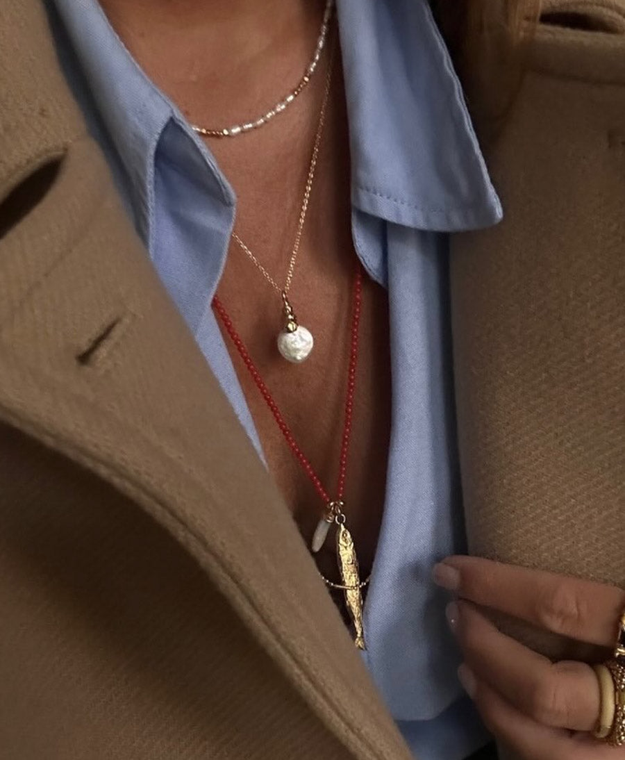 Farbige Halskette von dem Label Mimi et Toi aus Amsterdam. Mit schönen kleinen roten Perlen aus Koralle und vergoldetem Verschluss und Fisch-Anhänger und Perlen-Anhänger. Die rote Koralle steht für Leidenschaft und Mut und der Fisch symbolisiert Harmonie, Fülle, Glück, Erneuerung, Liebe und das Gleichgewicht zwischen Geist und Gefühl.