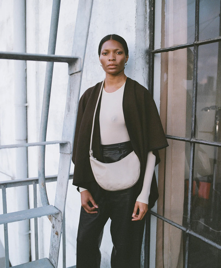Eine weiche, hochwertige Ledertasche in einer Halbmond-Form die sehr vielseitig ist. Mit einem gerollten Träger zum Knoten und welcher sich angenehm auf der Schulter tragen. Dank dem verstellbaren System, kann die Tasche als Schultertasche (Träger doppelt genommen) oder als Umhängetasche getragen werden. Mit Reissverschluss und ohne Innenfutter.