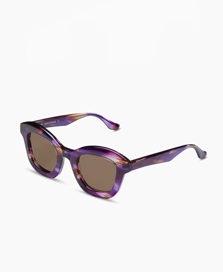 Eine moderne Sonnenbrille aus nachhaltigem, biologisch abbaubarem Acetat (Zellulose von Baumwolle). Ein schönes Zusammenspiel für einen modernen und zeitlosen Look. Die Farbe ist gemustertes Violett (mit Brauntönen und Lilatönen). Die Brillengläser haben keinen Verlauf.