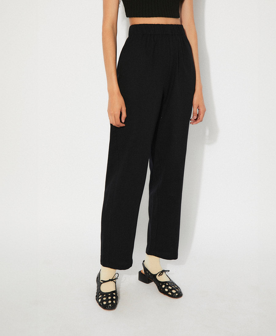 Entspannte und gerade geschnittene Stoffhose mit elastischer Taille. Ethisch korrekt hergestellt in Portugal aus weicher 100% Baumwolle. Erhältlich in den Grössen: XS, S, M & L.