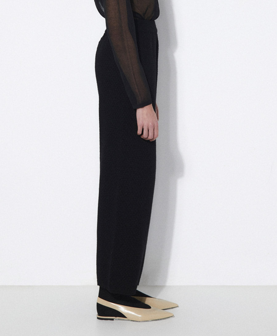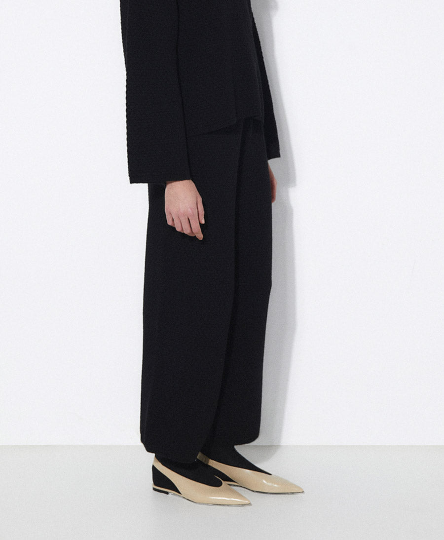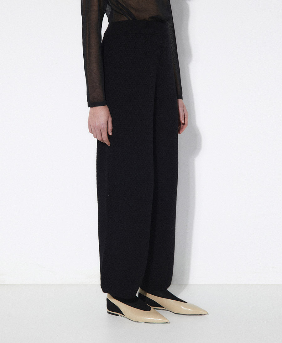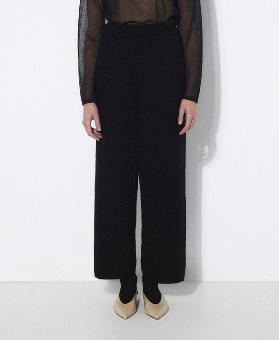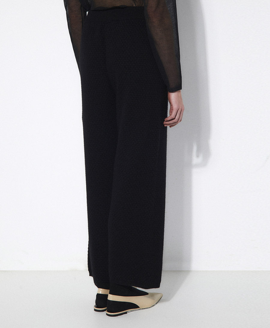 Strukturierte, locker sitzende, knöchellange Strickhose. Hoch taillierter Schnitt mit seitlichen Eingrifftaschen und weit ausgestelltem Bein. Verstellbarer elastischer Bund.