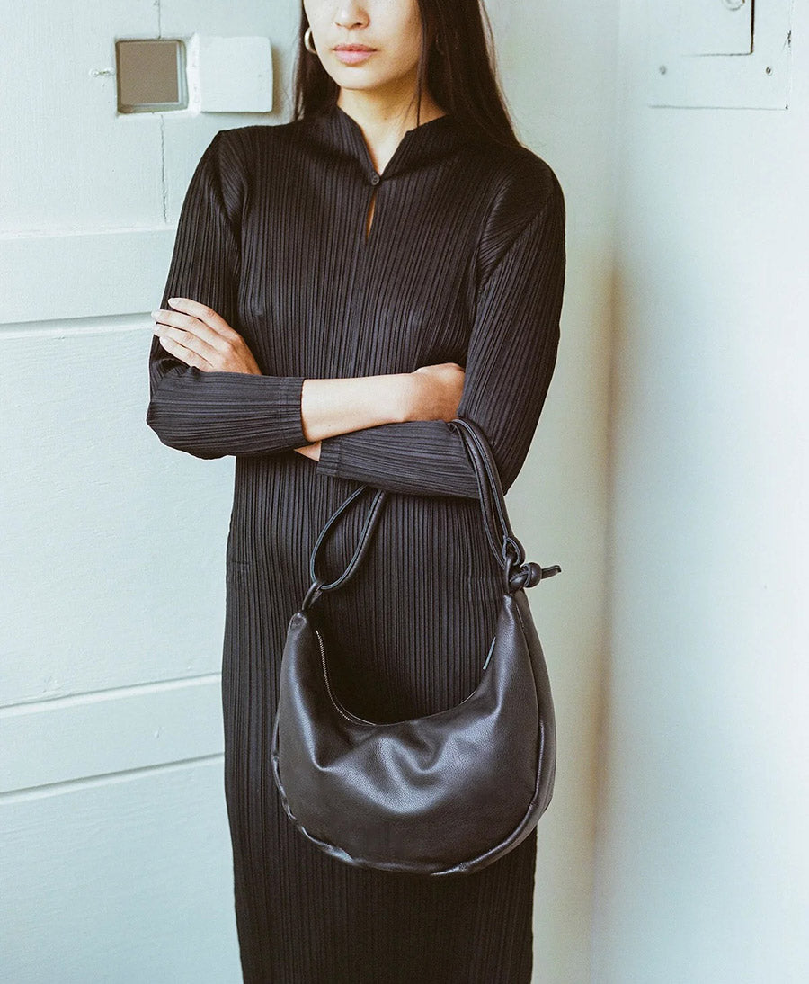 Eine weiche, hochwertige Ledertasche in einer Halbmond-Form die sehr vielseitig ist und jetzt noch in grösserer Version erhältlich ist. Mit einem gerollten Träger zum Knoten und welcher sich angenehm auf der Schulter tragen. Dank dem verstellbaren System, kann die Tasche als Schultertasche (Träger doppelt genommen) oder als Umhängetasche getragen werden. Mit Reissverschluss und ohne Innenfutter.