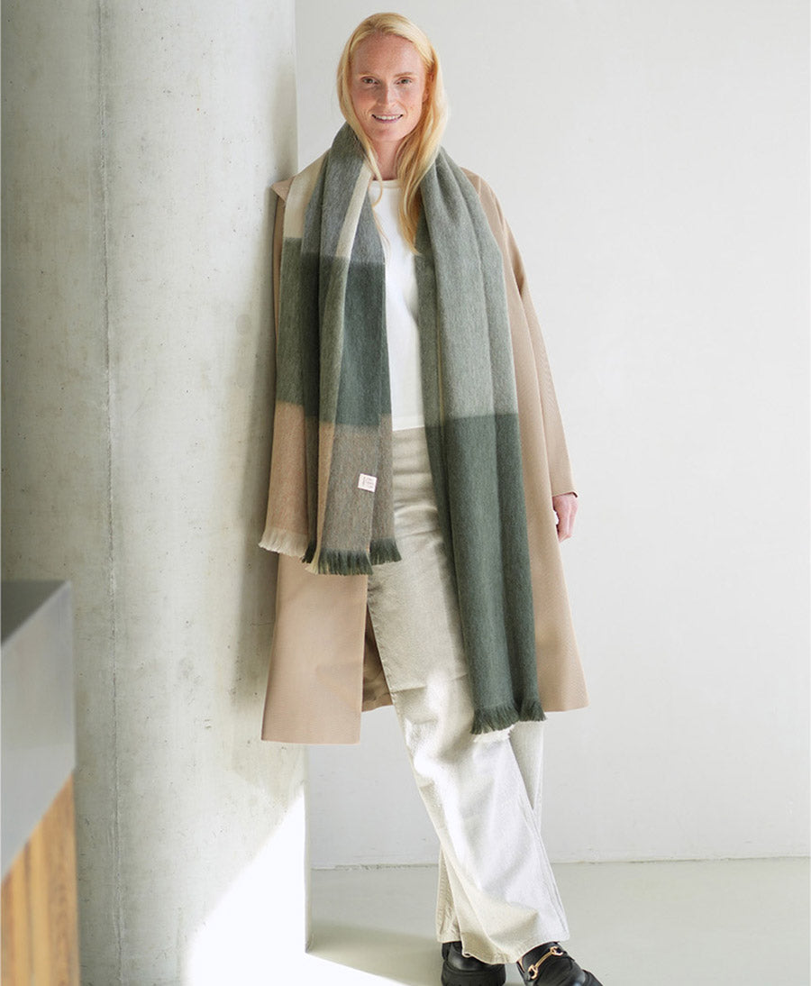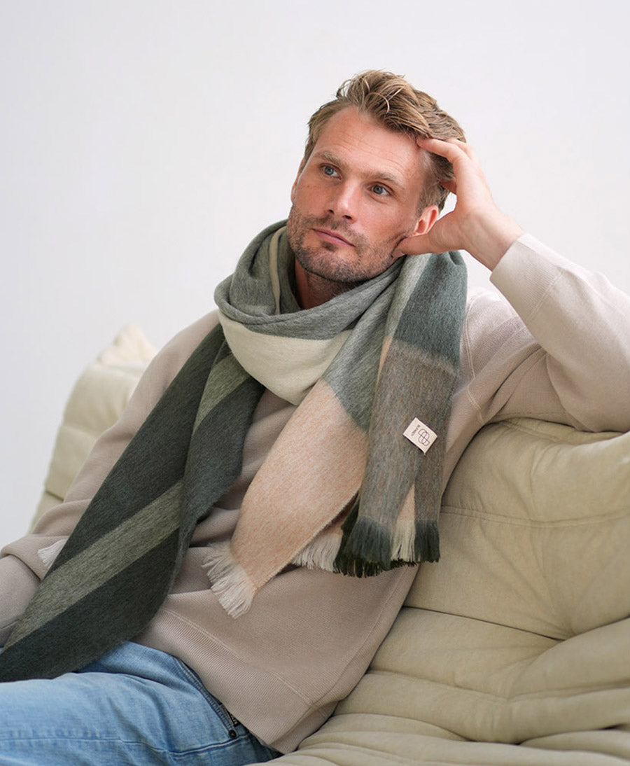 Im Gegensatz zur Schafwolle ist die Alpakafaser viel weicher und enthält kein Lanolin mit dem schönen Nebeneffekt, dass sie von Natur aus hypoallergen ist. Um die Bufandy-Schals noch weicher zu machen, werden die Fasern am Ende des Webvorgangs durch Bürsten aufgeraut. Dadurch werden die Schals besonders weich und fühlen sich auf der Haut einfach toll an.