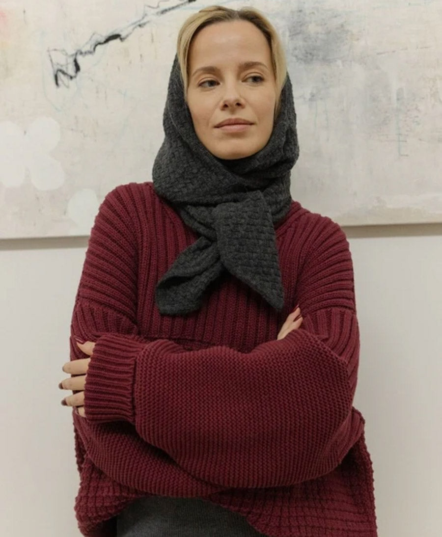 Der Radvilaitė-Kapuzen-Schal wurde von seiner Namensgeberin inspiriert: Barbora Radvilaitė, Grossherzogin von Litauen. Der Stoff wurde durch gekonntes Zusammenspiel von rechten und linken Maschen geschaffen, um die Perlenstruktur der Kopfbedeckungen nachzubilden, die in den frühen Bildern von Radvilaitė selbst zu finden sind. Hergestellt aus 90% Superfeiner Wolle, 10% Kaschmir.