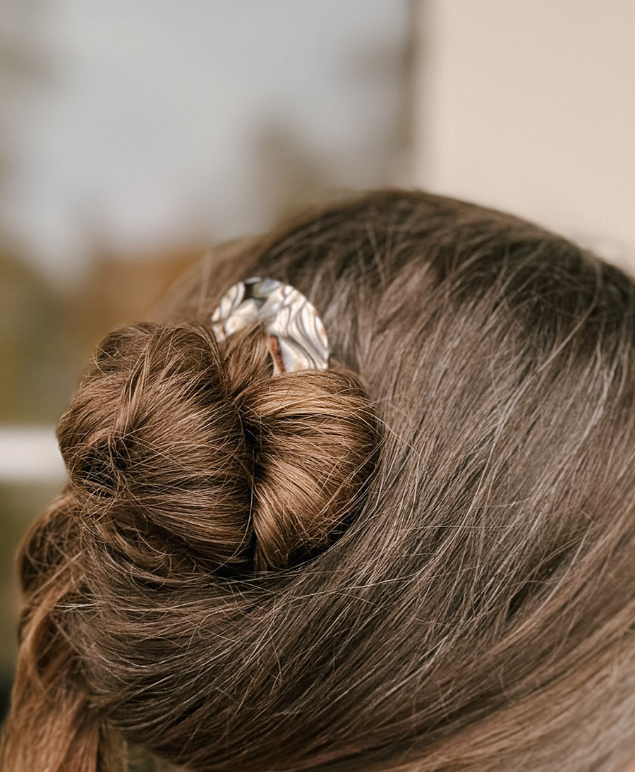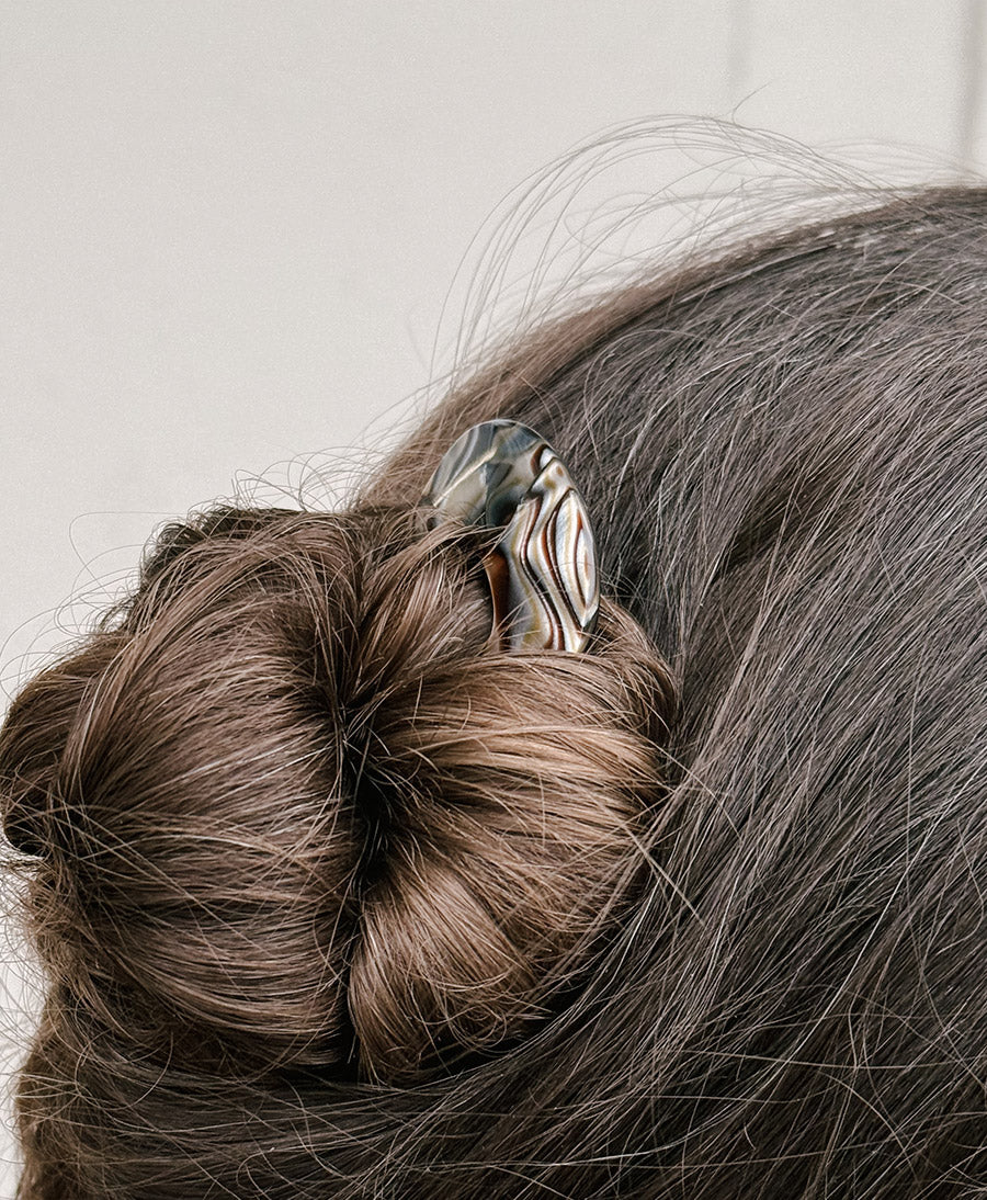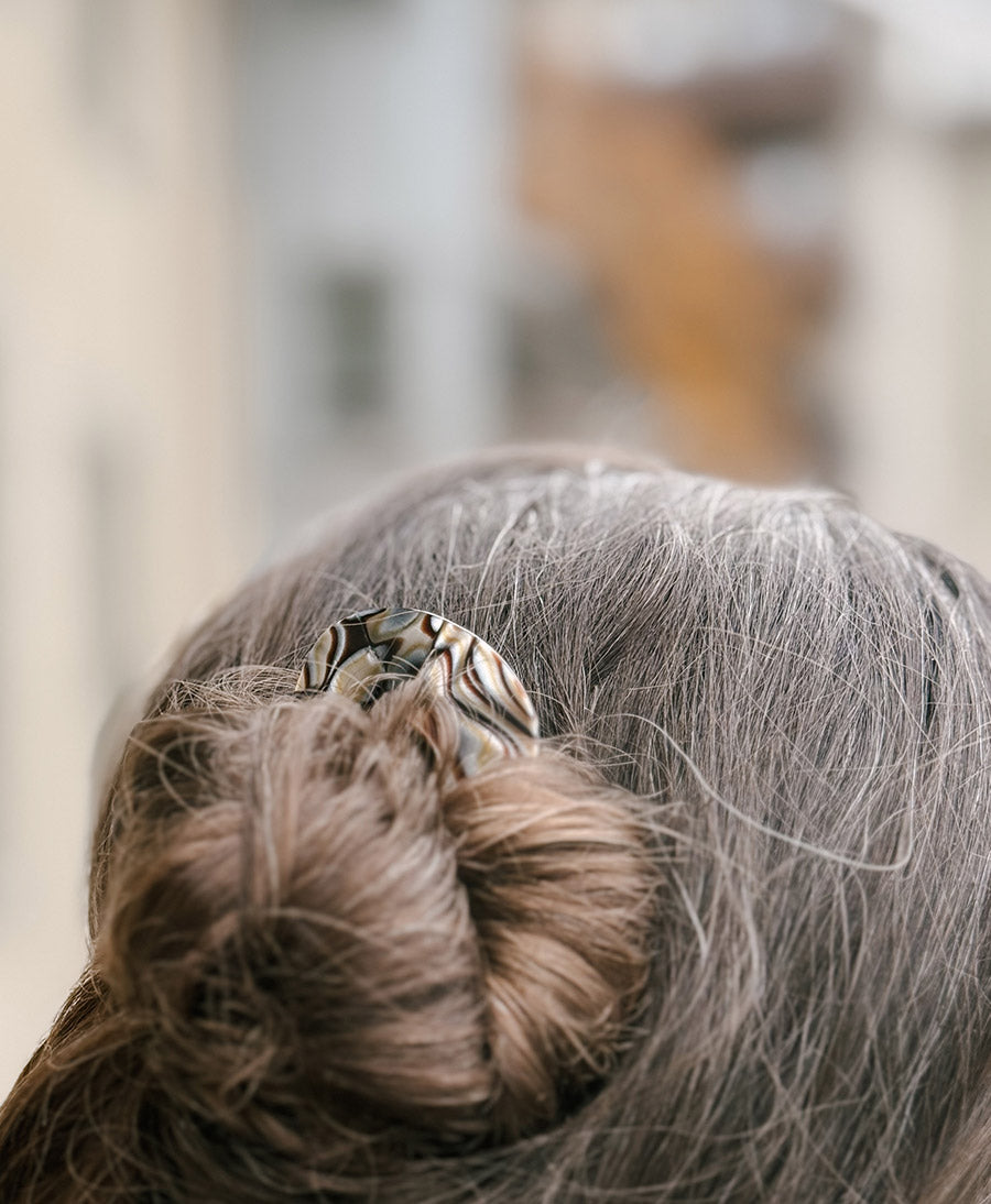 Haarnadel aus Acetat. Hergestellt in einem Traditionsbetrieb in Frankreich, nahe der Grenze zur Schweiz.