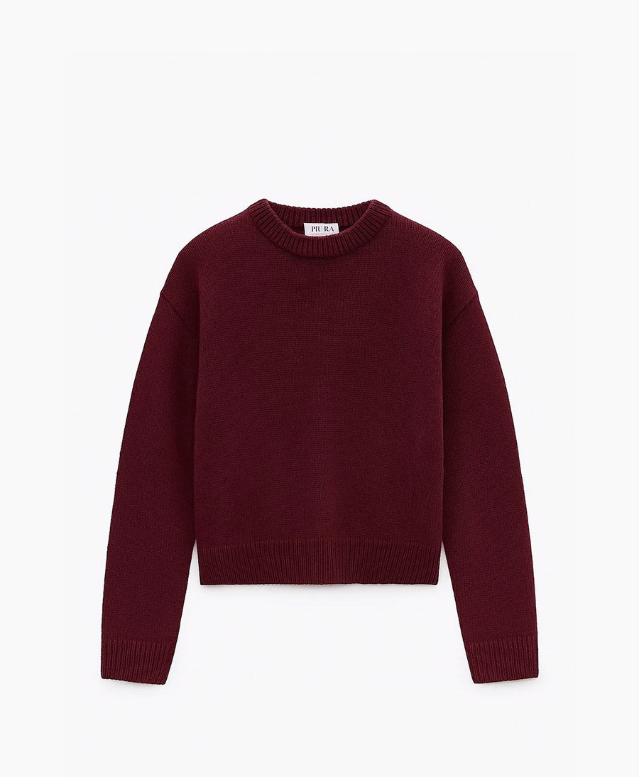 Bequemer und warmer Strickpullover mit Rundhalsausschnitt aus rezykliertem Kaschmir und rezyklierter Seide vom Schweizer Label PURA Clothing. Sehr angenehmer und weicher Stoff mit grobmaschigen Strickmuster. Mit einem geraden, kastigen Schnitt. Farbe: Burgundy / Dunkelrot.