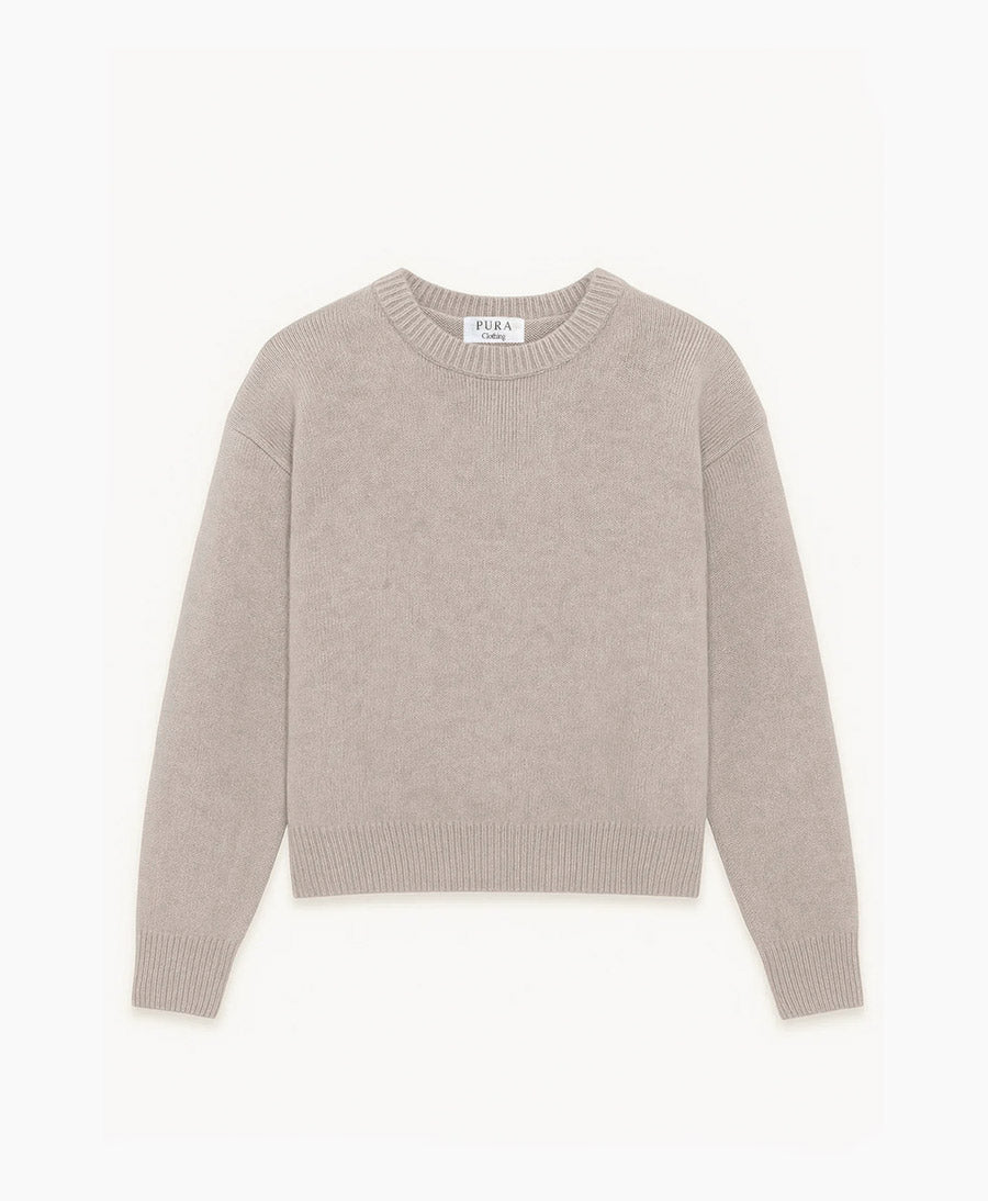 Bequemer und warmer Strickpullover mit Rundhalsausschnitt aus rezykliertem Kaschmir und rezyklierter Seide vom Schweizer Label PURA Clothing. Sehr angenehmer und weicher Stoff mit grobmaschigen Strickmuster. Mit einem geraden, kastigen Schnitt. Farbe: Greige (Grau-Beige).